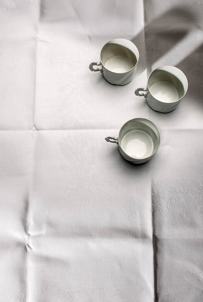 Voor het oog ziet bovenstaande foto er simpel en aannemelijk uit, maar pas als je bewust wordt van het feit dat de voorzijde van de kopjes niet in de schaduw kunnen staan, krijgt het beeld een andere lading. Het was dit schilderij dat mij op het spoor bracht.
